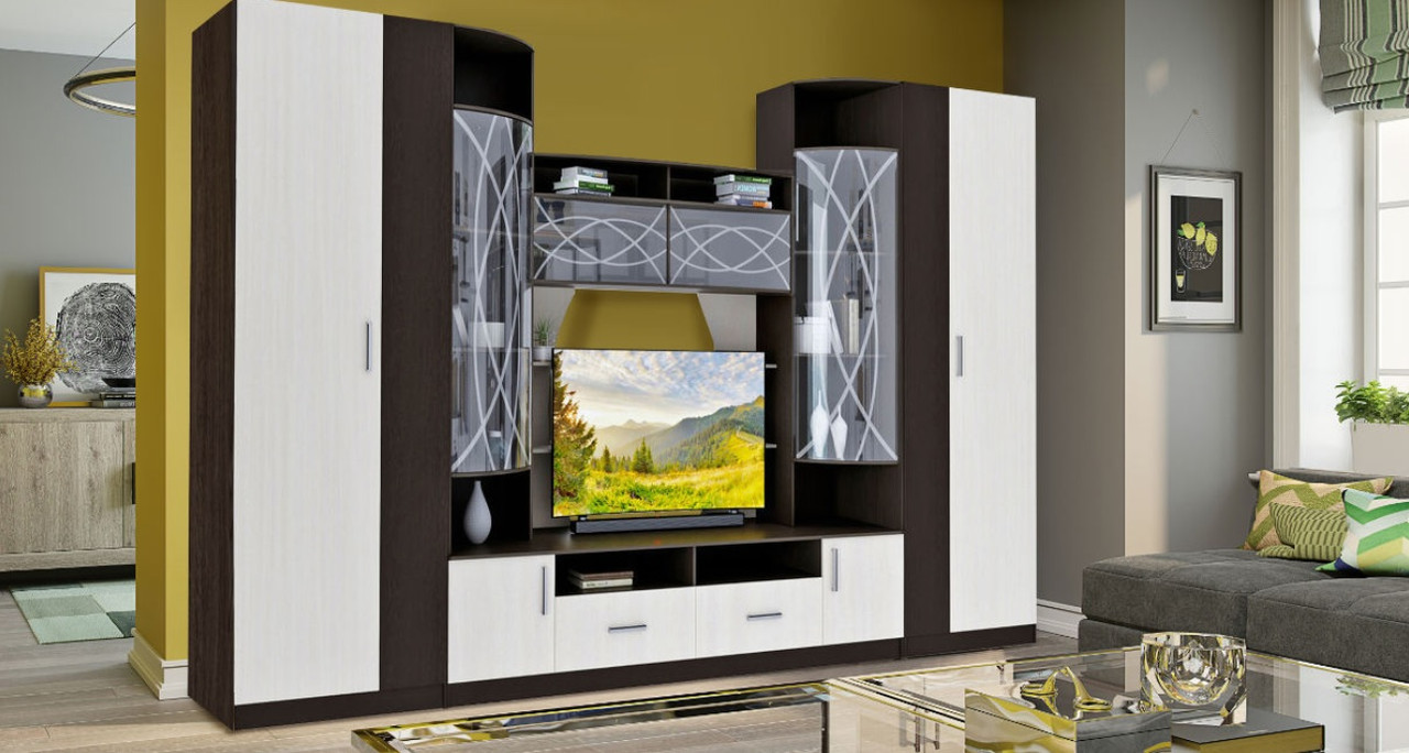 Стенка «Атланта» представляет собой единую конструкцию, которая отличается достаточной вместимостью. Она будет выгоднее смотреться в просторных гостиных. Такая конструкция будет выглядеть солидно за счет цветового исполнения изделия и угловых шкафов – витрин. Индивидуальность данному предмету мебели придает симметричность витражного рисунка на тонированном стекле.