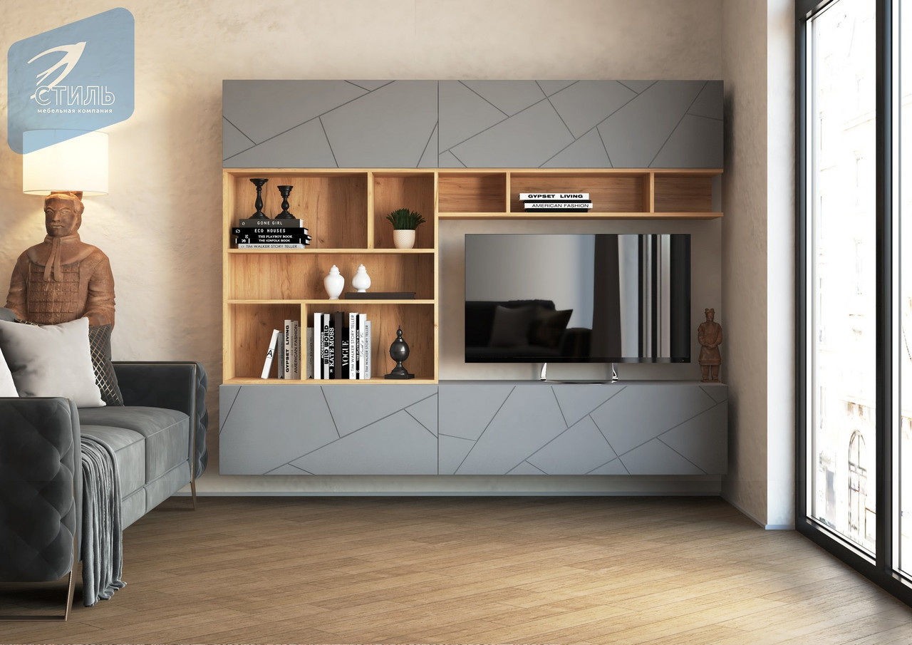 Корпус: Изготовлен из высококачественного ламинированного ДСП в сером цвете "Шифер", который придает гостиной элегантный и современный вид.