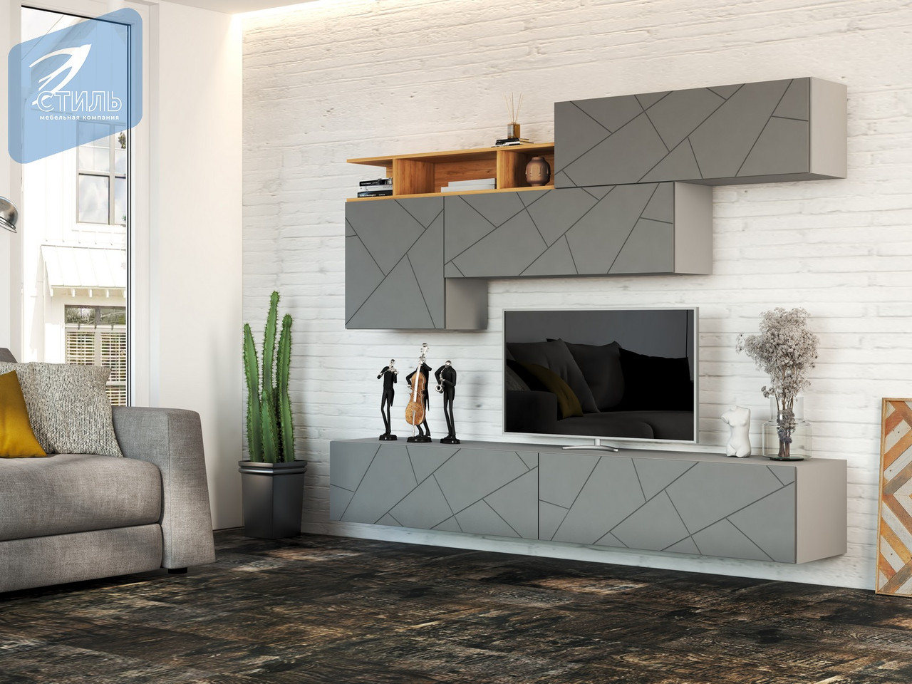 Эта модульная гостиная в сером цвете прекрасно сочетает в себе современный стиль и минимализм, создавая элегантную и функциональную обстановку.