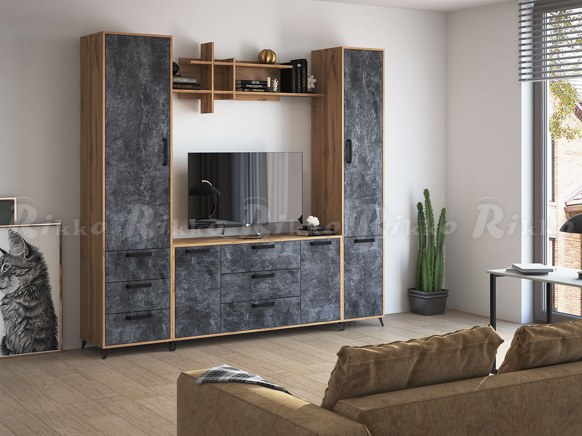 Представляем вам элегантный и стильный комплект мебели для гостиной из коллекции "Пируэт". Особая изысканность этой мебели проявляется в сочетании цветов: темный бетон фасадов и теплый оттенок дуба вотан для корпуса. Комплект включает в себя тумбу-комод с шариковыми направляющими полного выдвижения, два шкафа-пенала с полками и выдвижной штангой, а также стильную навесную полку. Ваша гостиная станет идеальным пространством для отдыха и приема гостей. Купите эту современную и недорогую мебель для гостиной, и она станет ярким украшением вашего интерьера. Выбирая модульную мебель, вы получаете возможность создать уникальную композицию, которая отразит ваш стиль и предпочтения. Наслаждайтесь современной красотой и функциональностью этого гостиного гарнитура, а шкафы обеспечат удобное хранение вашей коллекции книг, предметов и других необходимых вещей.