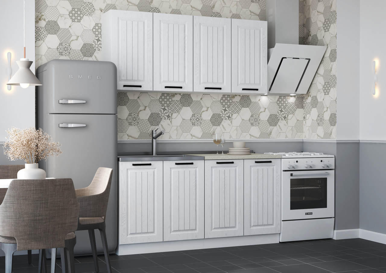 Компактный кухонный гарнитур Виола Нео Классика (Кантри) – гармоничный тандем классических традиций и современных тенденций в дизайне мебели для кухни. Спокойная, мягкая цветовая гамма модели, а также фасады с декором, имитирующим деревянные рейки, создают в помещении неповторимую атмосферу домашнего тепла и уюта. Стильные черные ручки подчеркивают элегантный образ гарнитура.
