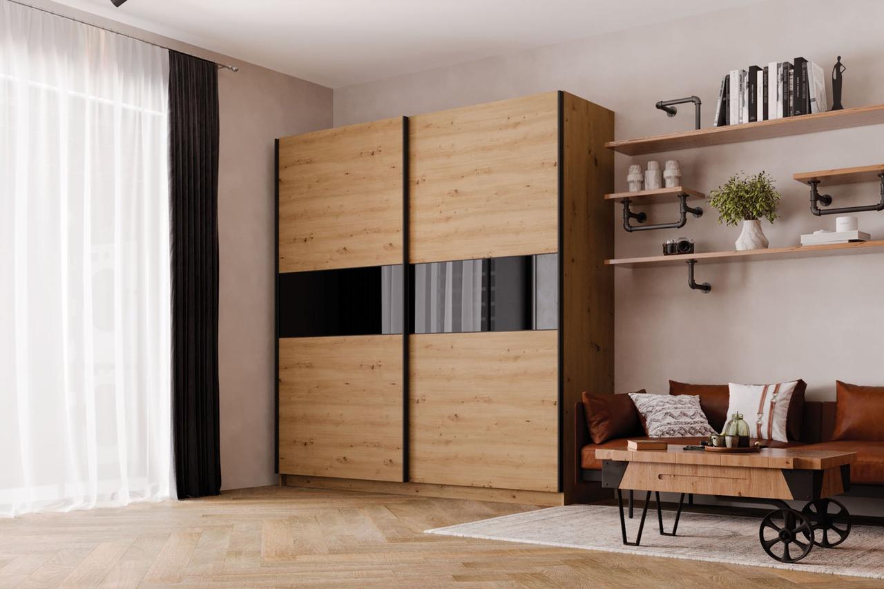 Шкаф-купе Марвин-3 – стильное и удобное решение для Вашей гостиной, прихожей либо спальной комнаты. Включает в себя два отсека с множеством полок и пространство со штангой для одежды в центре. Цветовое сочетание "Дуб дикий" и "Чёрный глянец" внесёт яркость и уют в Вашу комнату. Фасады изготовлены из ЛДСП и покрыты специальным глянцевым лаком на покрасочной линии. Профиль выполнен в чёрном матовом цвете с покрытием Soft Touch.